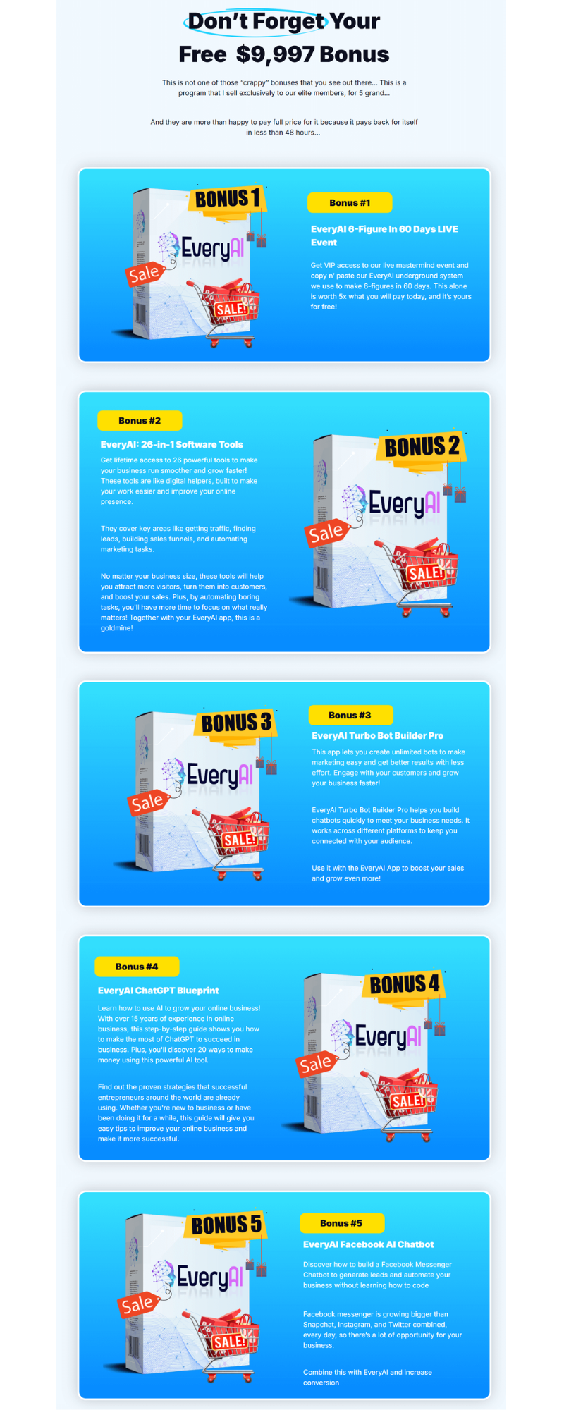 Bonuses for the EveryAI Review Audience: You’ll get all the bonuses listed on the Salespage,